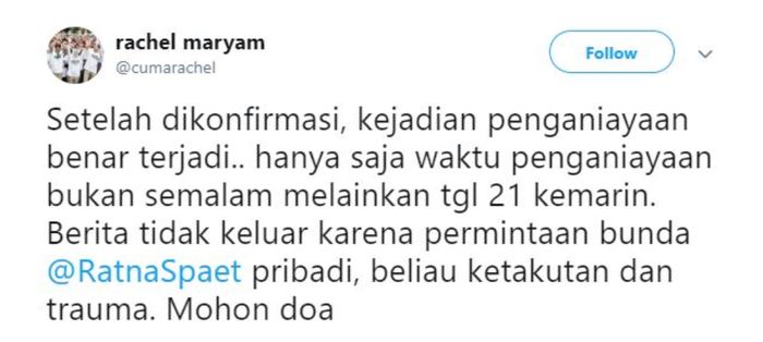 "Berita tidak keluar karena permintaan bunda @RatnaSpaet pribadi, beliau ketakutan dan trauma. Mohon doa," tulis Rachel Maryam dalam twitternya.