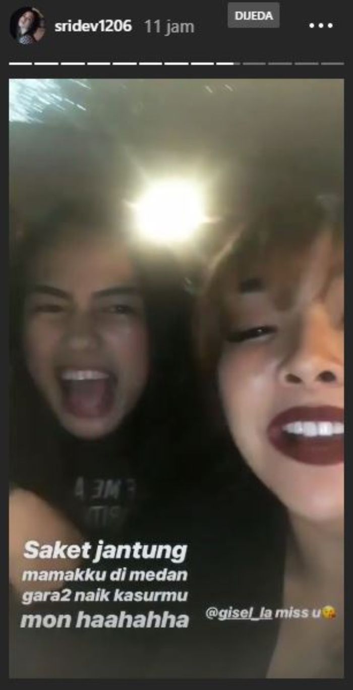 "Saket jantung mamakku di mean gara2 naik kasurmu mon haahahha," tulis Sri Devi dalam update Instagram Stories miliknya.