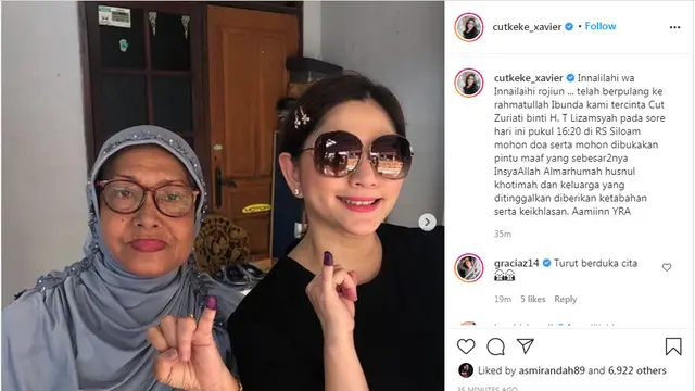 "Inna lillahi wa inna ilaihi raji'un. @cutkeke_xavier dear turut berduka cita atas wafatnya rahimahullah ibunda Tercinta. Semoga Allah menempatkannya di tempat yang paling indah bersama orang-orang beriman, dan semoga keluarga yang ditinggalkan diberi kesabaran . Aamiin," tulis Ingrid Kansil.